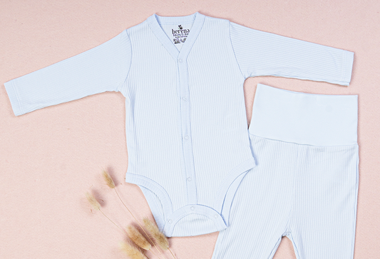 100% Cotton Baby Bodysuit & Pants Set Ribbed Blue