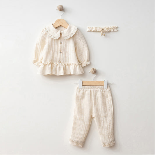 Cream Muslin Baby 3 Piece Girl Set