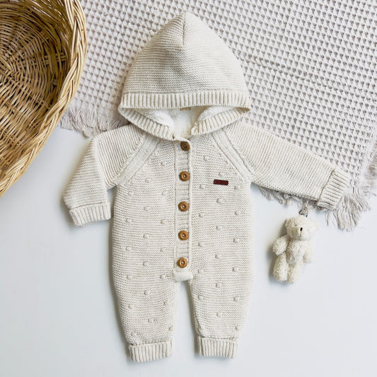 Baby Hooded Knit Jumpsuit with Wooden Buttons