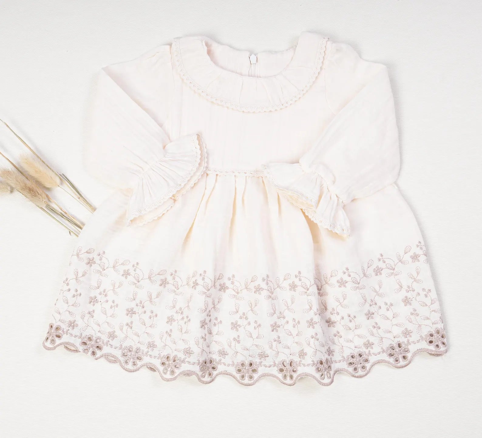 Add a touch of charm and sophistication to your baby girl's wardrobe with our Natural Muslin Dress for Baby Girls. Perfect for special occasions like flower girl ceremonies or baptism celebrations, this enchanting dress is crafted from 100% breathable cotton muslin. Designed to keep your little one comfortable while looking stylish, this dress features a delicate floral embroidery on a lovely white fabric for timeless beauty.